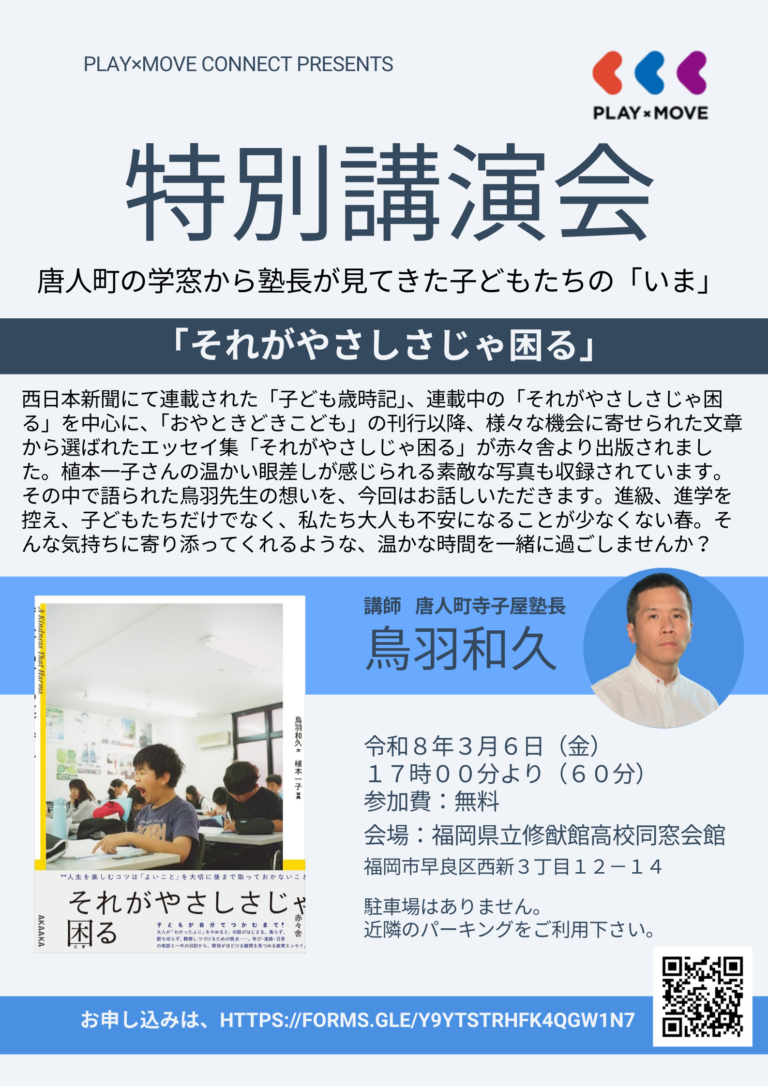 2週間後の3月6日(金)に修猷館高校同窓会館にて講演を行います。主催は福岡で非常に興味深い活動をなさっているPLAY×MOVE。一人で福岡市内で喋るのかなりひさしぶりです。無料ですので気軽に熱くご参加ください(要申込)