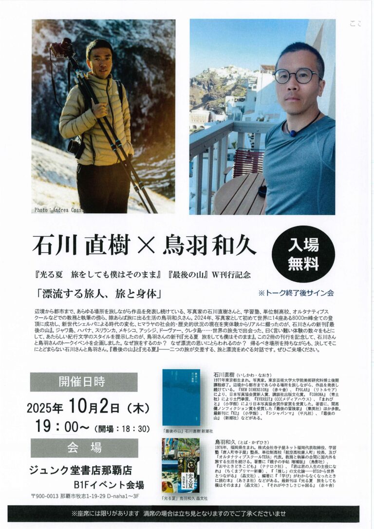 【イベント情報】石川直樹 ✕ 鳥羽和久 晶文社刊『光る夏 旅をしても僕はそのまま』新潮社刊『最後の山』W刊行記念トークイベント「漂流する旅人、旅と身体」 日時:2025年10月2日(木)19時~ 場所:ジュンク堂書店那覇店 B1Fイベント会場