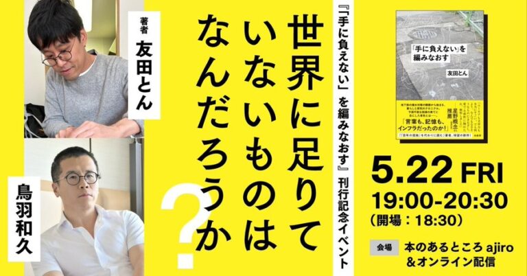 【福岡】5/22(金)『「手に負えない」を編みなおす』刊行記念イベント 「世界に足りていないものはなんだろうか?」ゲスト:友田とんさん、鳥羽和久さん【本のあるところ ajiro】
